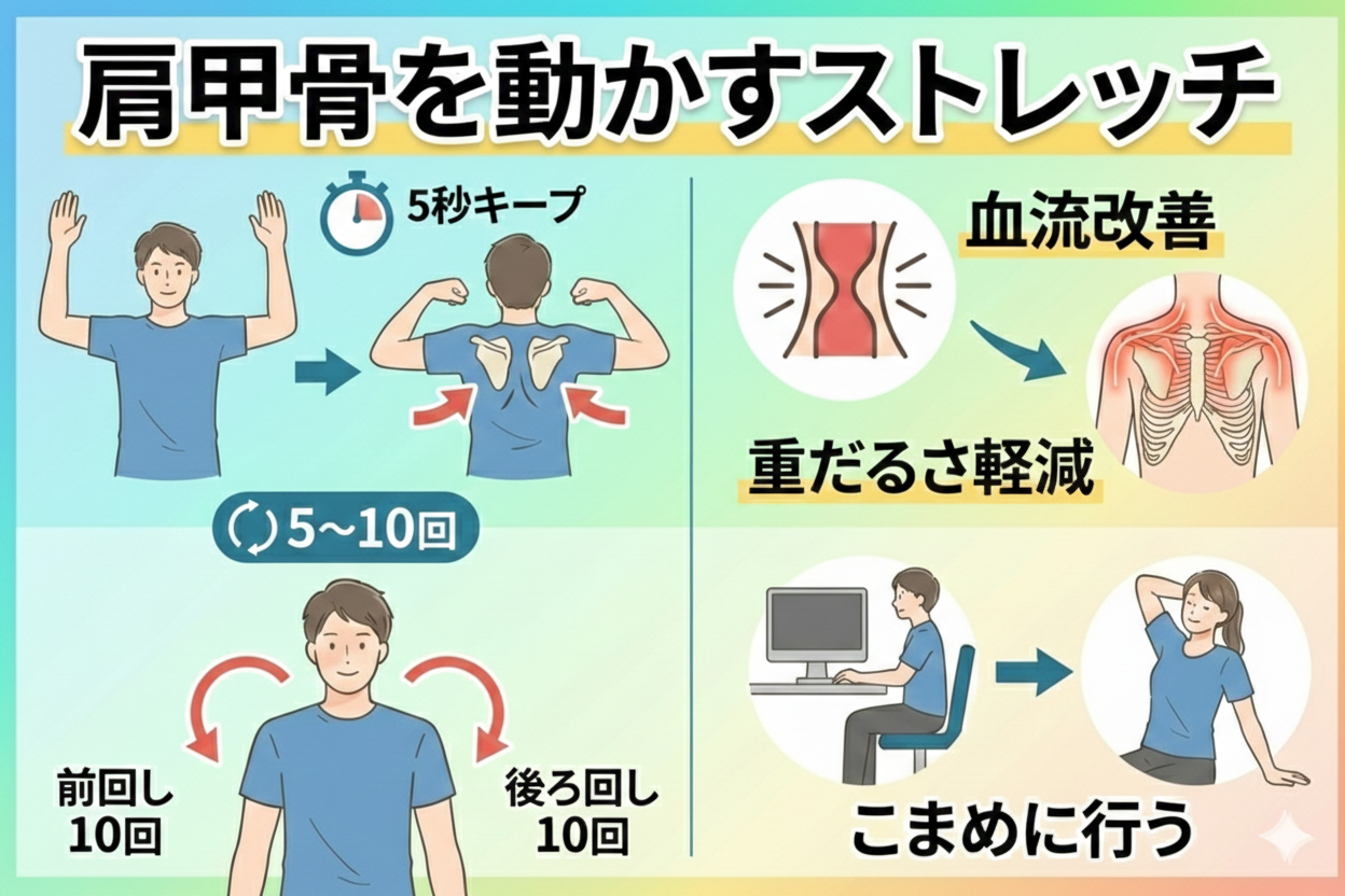 また、肩を大きく回す動作(前回し・後ろ回し各10回)も効果的です。