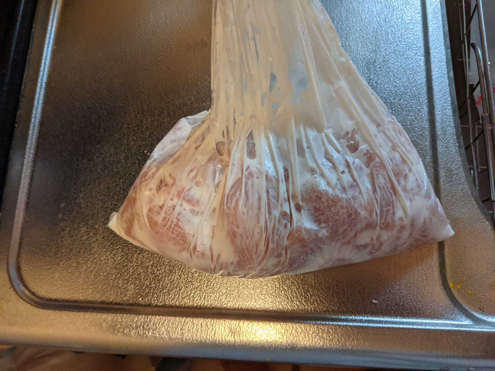 9、ヨーグルトと着けていた胸肉をヨーグルトごと入れていきます。