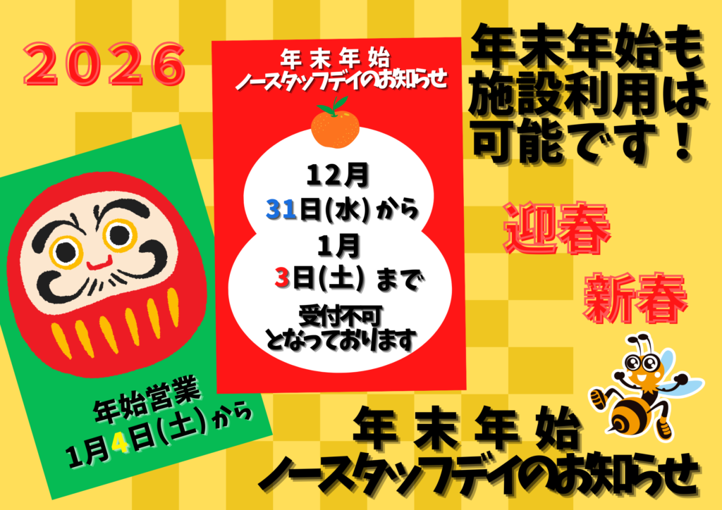 年末年始もジムは利用できますが、12/31~1/3はスタッフ不在のため各種受付は対応不可となります。